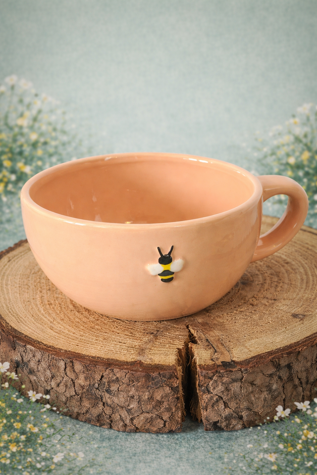 Featuring a ceramic teapot sat atop a dusky pink/ cornflower blue mug, a large embossed bee is painted on the side, whilst florals and bees are peppered sit along the teapot.