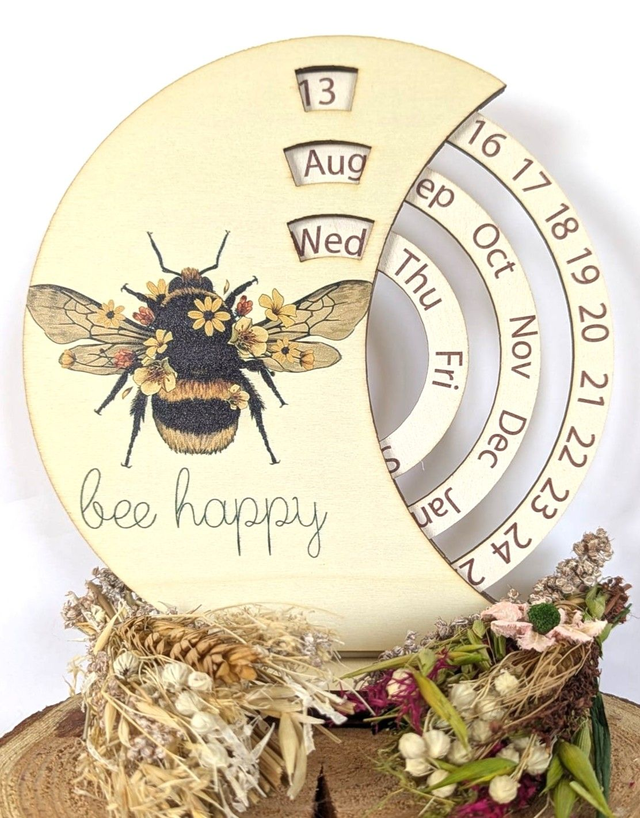 Charming and practical, this natural wooden desk calendar features a little bee detail and easy-to-rotate date blocks. A timeless piece for your home or workspace.
