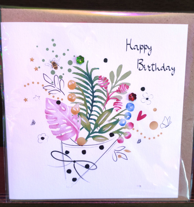 A hand-illustrated birthday card featuring a playful botanical arrangement, finished with a small number of delicate sequin accents for a subtle touch of sparkle. The design has a relaxed, contemporary feel and is perfect for celebrating birthdays in a thoughtful way.