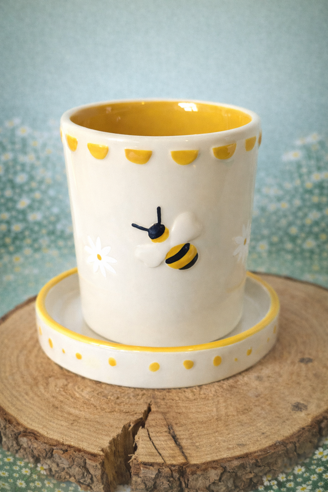 Two stripy bumblebees appear on either side of the planter, interspersed with dainty white daisies, each of which is left unglazed thanks to a wax resist technique.