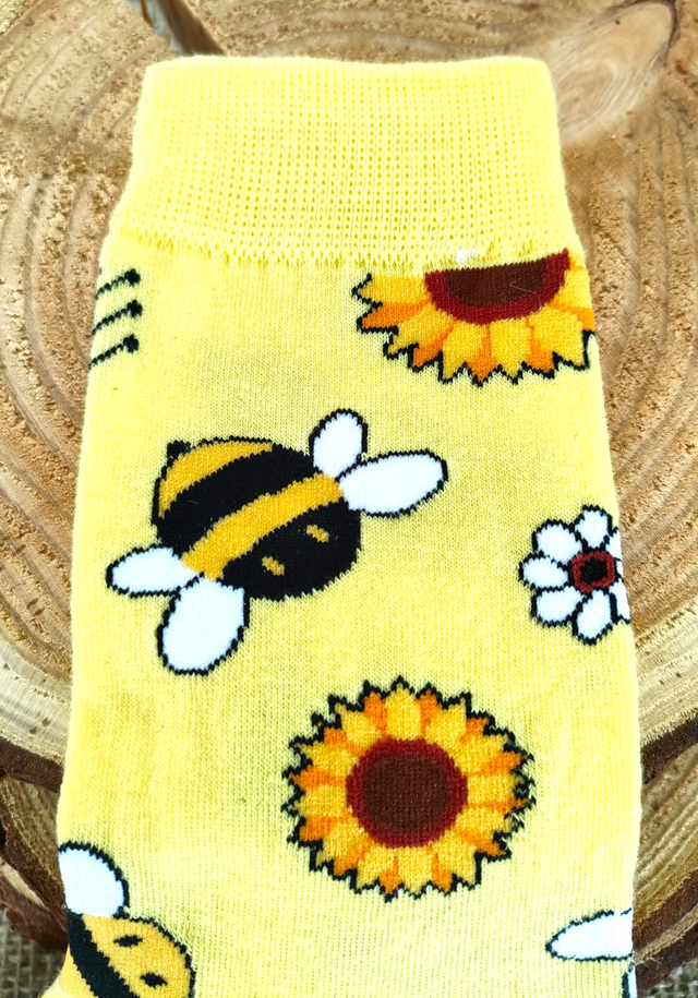 Bright yellow socks with buzzing bees and sunny sunflowers — a perfect pair for cheerful little feet. Snuggly and stretchy for all-day comfort.